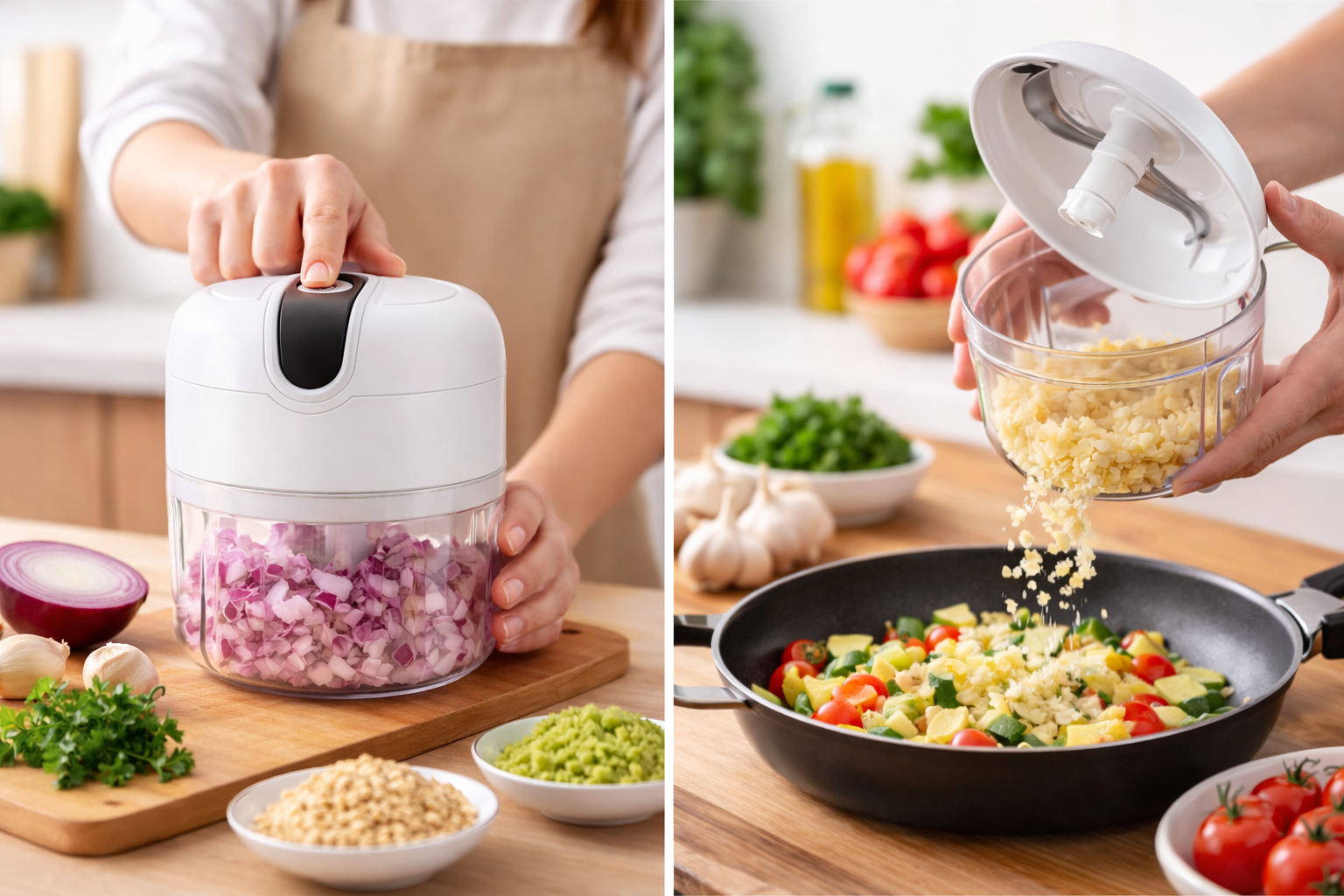 Apresentamos o Mini Processador Elétrico Portátil KitchenPratic, perfeito para agilizar o preparo das suas receitas com praticidade e eficiência. Com capacidade de 250ml, este triturador é compacto e fácil de usar, ideal para picar alho, pimentas, nozes e vegetais diversos. Suas lâminas duplas em aço inox garantem cortes precisos e rápidos. O design portátil e leve permite manuseio confortável e armazenamento facilitado. Sua estrutura à prova d'água facilita a limpeza, mantendo o aparelho sempre higienizado. Recarregável via USB, oferece autonomia para uso diário com rapidez. Conte com tecnologia e praticidade para transformar seu dia a dia na cozinha.